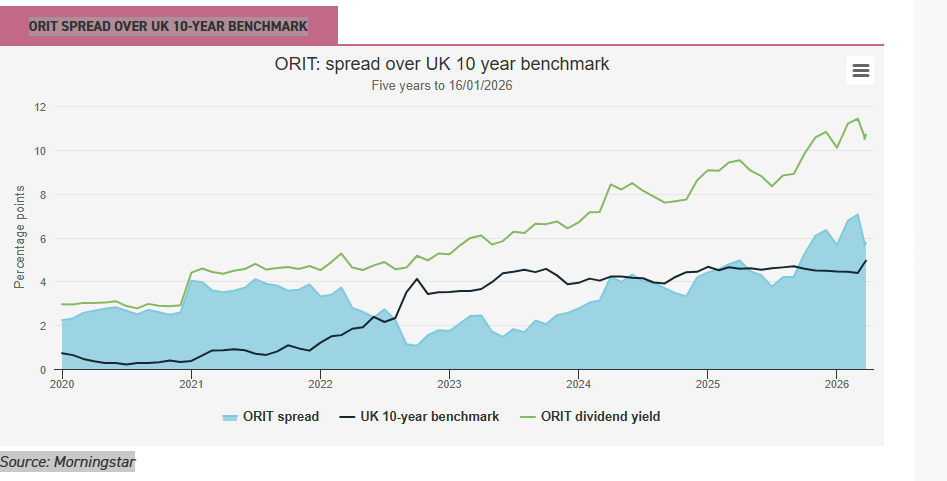 Clearly though, the macro backdrop remains challenging, with ORIT’s peer group of renewable energy infrastructure trusts all trading at wide discounts and, in many cases at dividend yields of 10% or more. This is an interest-rate sensitive asset class, and current events in the Persian Gulf are taking their toll on government bond yields, with the UK 10-year benchmark bond yield briefly touching 5% in recent days. ORIT’s near-term power prices are 88% fixed (for two years) so a short-term spike in energy prices will have little impact, although if longer-term futures rise, there may be opportunities to fix at higher rates further out. Rising interest rates will have an impact, but given these are likely to be a response to higher inflation, and half of ORIT’s portfolio is inflation-linked, revenues would rise, providing partial protection. So, there are push and pull factors that investors need to consider. But in considering the chart below, which shows ORIT’s dividend yield as a spread over the above mentioned 10-year benchmark, it’s worth reflecting that this lifetime-high gap comes at a time when, once again, the UK and other European countries are under pressure to evolve their energy security policy. Notwithstanding the uncertainty around bond yields and inflation, the valuation of assets that generate power without any reliance on global hydrocarbon supply chains seems like an anomaly investors should be paying more attention to.