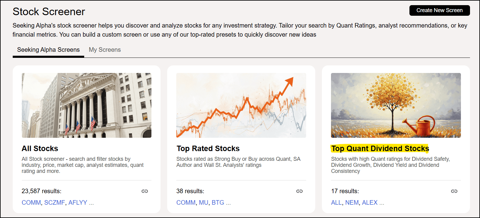 When evaluating dividend stocks, I try to look beyond headline yields, analyzing the safety and growth potential of a given dividend. Leveraging Seeking Alpha’s stock screener, I selected “Top Quant Dividend Stocks” to get my initial universe of high-quality income stocks.