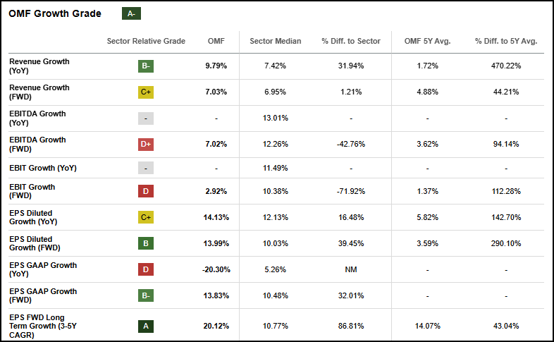 OMF’s FWD dividend yield is 134% above the sector median and has delivered five consecutive years of increases. The dividend is also backed by a “B+” Dividend safety grade, supported by a cash dividend payout ratio that’s 64% below the sector median. OMF’s success in the face of macroeconomic uncertainty, including solid credit improvement and expanding high-quality loan originations, bodes well for its future potential.