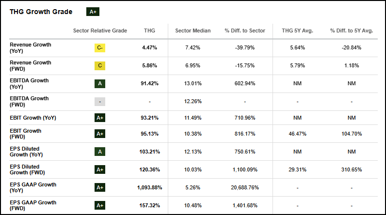 Margin improvements across all core segments have contributed to the stock’s solid profitability. THG boasts an ROE that is 78% above the sector median and has $854M in cash from operations vs. the sector’s $175M. Several strategic initiatives, including tech and operational investments and geographic diversification, have helped the company secure sector-leading growth. The company possesses both year-over-year and forward-looking earnings growth in excess of 100%.