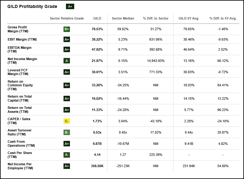 Gilead CEO Daniel O’Day noted in the company’s Q1 earnings call that the “vast majority” of the company’s IP and more than 80% of its profits are recognized in the U.S. This structural difference should continue to advantage the company from a profitability standpoint, with an EBITDA margin that is nearly 400% above the sector median.