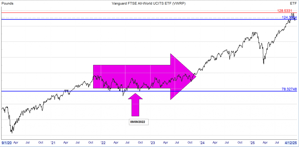 If instead of starting the Snowball, you invested 100k in VWRP your portfolio would be worth £150,426. Whilst it’s very high risk to invest all your capital into one share as you can see from the chart, you made nothing, zero zilch, nothing for 2 years at the arrow.