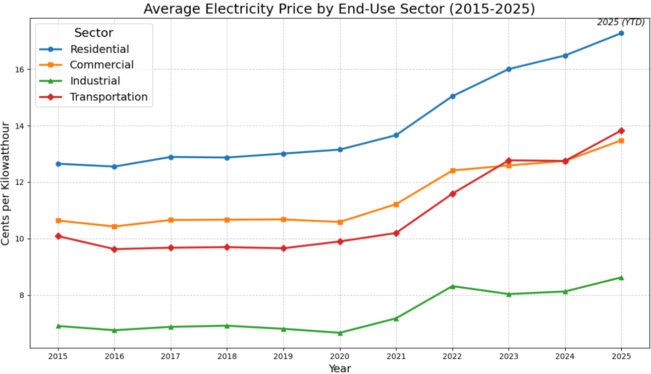 Utility costs continue to outpace inflation, driven by heavy demand from big tech data center ambitions. The U.S. power grid is aging and inadequate for the soaring demand, making the unit costs higher for every sector, with the residential base experiencing the worst effects. Data Source