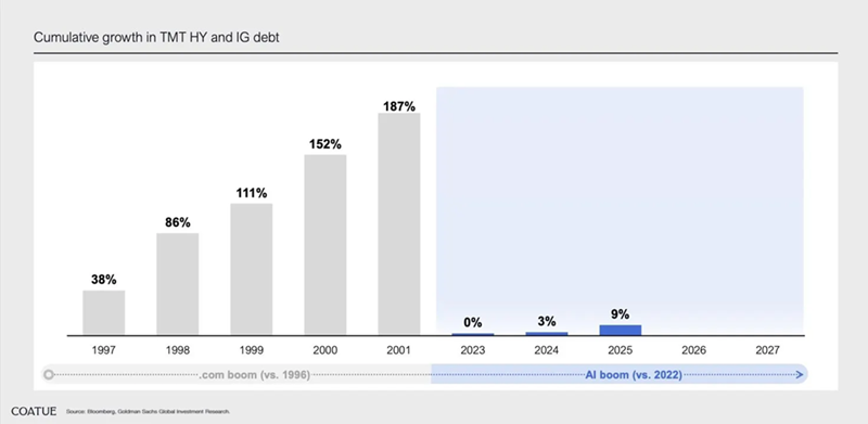 Here we see that over the last three years, there has been surprisingly little growth in the amount of money invested in corporate bonds issued to fund the tech, media and telecom sectors. (That’s the “TMT” in the title – those are the companies like Google, Microsoft, Meta and Oracle.)