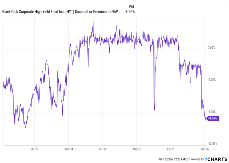 In the last six months, HYT’s discount to net asset value (NAV) has dropped to levels not seen since 2022 and 2023, after a long period of trading around par. This is an opportunity for us, putting short-term upside on the table if the fund’s discount evaporates again, like it did at the end of 2023.