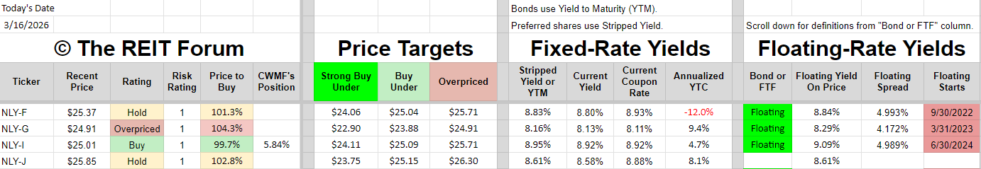 NLY-G is almost always above our targets. I punish it for having such a thin floating spread. The market doesn’t seem to mind, but I find it as a bigger issue because it makes NLY-G even more reliant on short-term interest rates.