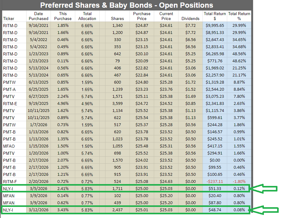 I’ve been buying NLY-I lately. This screenshot is from our tool for subscribers that shows all our open positions. We separate the preferred shares and baby bonds from the other sectors, so this only shows the preferred shares and baby bonds: