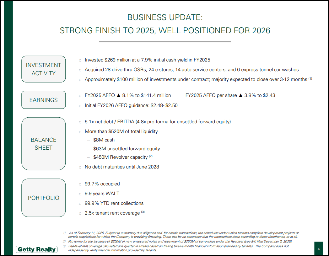 Interest rate cuts can benefit the company’s model long-term by freeing up capital. The company finished 2025 strong and well-positioned for 2026. As highlighted in its Q4 2025 earnings, GTY’s 2025 Fiscal Year AFFO earnings were up 8.1% to $141.M. The company showcases a strong balance sheet, 99.7% occupancy, and nearly 100% YTD rent collections. Getty is highly profitable, as showcased by its A- Profitability Grade.