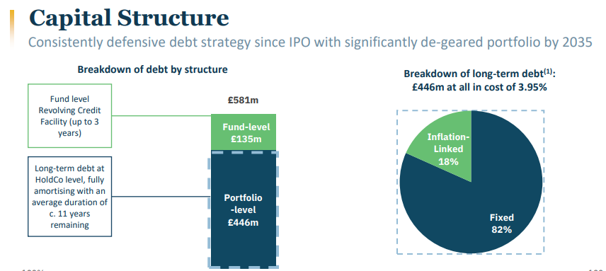 There’s no particular cliff edge to deal with, and the RCF of £135m has a three year life, and costs 1.85%+SOFR (so ~5.1%). The other debt is mainly fixed at 3.95%. Very competitive – and attractive.