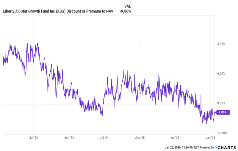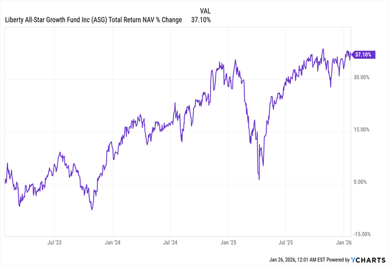 ![]() Recession in 2026? Here’s My Take (and a 9% Payer to Profit) by Michael Foster, Investment Strategist My prediction for 2026? Strange as it may sound, given the wild headlines we’re seeing pretty much daily, I’m calling for more of the same. As I said a couple weeks ago, I expect around 12% returns from the S&P 500 this year. That’s why we’ve been adding to the equity CEFs in the portfolio of our CEF Insider service. Today I want to talk about one of our holdings, in particular: a 9%-payer called the Liberty All-Star Growth Fund (ASG). We’re zeroing in on this one because its discount to net asset value (NAV, or the value of its underlying portfolio) is the biggest it’s been in three years. As a result, we can buy ASG, and its portfolio of US blue chips, for around 90 cents on the dollar. That markdown helps reduce any worries around valuation as the market keeps rising higher. Bubble Worries Are a Plus for Us (and This 9%-Paying Fund) Remember that recession we were told had a 100% chance of happening back in 2022? Well, we’re still waiting for it. Meantime, US GDP rose 4.4% at the last reading for the third quarter, and our most up-to-date estimate, the Atlanta Fed’s GDPNow indicator is showing over 5% growth for Q4. These are strong numbers, especially with average annual growth around 3%. Then there’s AI, which continues to spread through the economy, boosting productivity as it does. When you account for the AI effect, the 13.4% return the S&P 500 has put up over the last 12 months (versus its long-term average of 10.6% annualized) makes sense. The market is simply telling us that it’s pricing in a bit of extra juice from this new tech. So we’re going to go ahead and let the mainstream crowd fret. The truth is, the numbers don’t support the idea of a bubble right now. That’s one reason for the 9.8% discount on ASG, which sports a high-quality portfolio of US blue chips like NVIDIA (NVDA), Microsoft (MSFT) and Apple (AAPL), as well as domestic-focused midcaps like property manager FirstService (FSV) and Pennsylvania retailer Ollie’s Bargain Outlet Holdings (OLLI). ASG Drops Into the Bargain Bin ![]() That 9.8% discount makes ASG particularly compelling when you consider that its NAV has gained 11.5% annualized over the last decade. Something else many CEF investors don’t realize is that a discount like this helps keep a fund’s dividend stable. That’s because, when you calculate ASG’s yearly payout based on NAV, not the discounted market price, you get 8.1%. This is significantly below ASG’s yield on market price and an easier figure for management to cover. That said, the point is pretty much moot when you consider that the fund’s 11.5% annualized NAV return over the last 10 years means it has been out-earning that payout for a long time. Now, we do need to bear in mind that ASG’s management ties its dividend to NAV, with the stated goal of paying 8% of NAV as dividends a year, so the payout does float around some. But given ASG’s strong NAV performance, the dividend has been pretty stable for the last three years. Steady Payouts at a Healthy Discount Source: Income Calendar But all that said, there is a question we need to ask: After three years of the discount getting steeper, should we worry it will never go back to where it used to be? To answer that, we need to look at where ASG’s total NAV return has gone in that three-year span. And it’s been nowhere but up: ASG’s Short-Term Performance: Strong ![]() Over the last three years, ASG has delivered about a 12% total NAV return, a bit above the 11.5% it’s posted over the last decade. Over the long haul, discounts like this tend to narrow in the face of such persistent strong gains. That makes this discount a sign that ASG is ripe for buying: The market will eventually reward this strong performance (and dividend). But if we buy today, we’ll get in at a discount before that happens. |