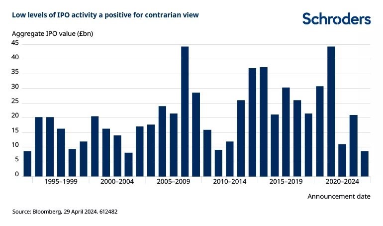 A pickup in IPOs would create a virtuous circle, according to Graham Ashby, a UK all-cap fund manager at Schroders. “History clearly shows that increased UK IPO activity typically corresponds with a short-term peak in the equity market – witness the high levels of IPO activity in 2008 and 2021, compared with current depressed levels,” he said.