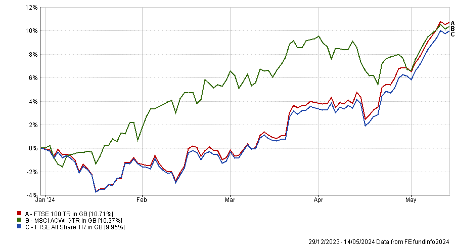 FTSE 100 and FTSE All Share vs MSCI ACWI, year-to-date