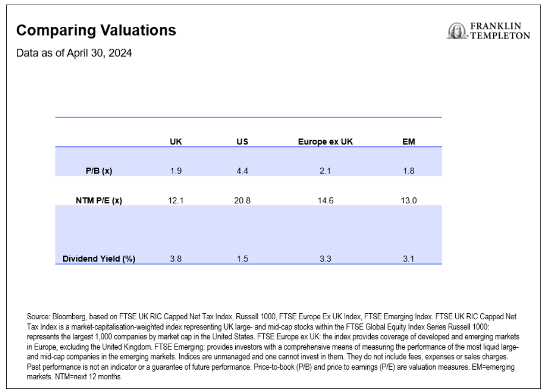 Marcus Weyerer, senior ETF investment strategist, EMEA at Franklin Templeton, said: “With a price-to-book ratio of less than 2.0, UK equities are currently trading at a discount of more than 50% compared to US equities. Additionally, in terms of forward price-to-earnings, they are closely aligned with emerging market levels. Furthermore, the UK has long been considered a haven for income investors, and it currently boasts a dividend yield of 3.8%.”